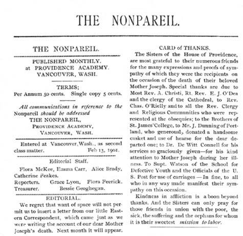 When Mother Joseph returned to Vancouver from her last trip to Montreal in 1899, she brought with her a printing press and bookbinding tools. The students at Providence Academy used the press to publish their monthly newspaper, The Nonpareil, for several years beginning in 1900. Subscriptions, at 50¢ per year, were sold to parents, clergy, and other benefactors of the school.
