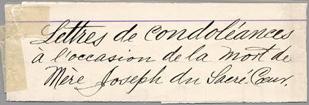 This paper wrapper was probably inscribed by Sister Mary Olive, Provincial Secretary at the time of Mother Joseph's death. It is maintained in the archives with a small collection of sympathy notes, part of the Personal Papers of Mother Joseph of the Sacred Heart.