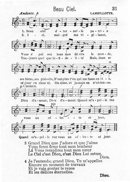 Reprinted from "Sunday School Hymn Book Compiled by Sisters of Notre Dame, Philadelphia" (Boston: Oliver Ditson, 1887, 1915). Originally from St. Patrick Hospital, Missoula, Montana, this hymnal was donated to the archives by Sister Mary Raymond, September 27, 1989. English translation by Sister Georgette Jean, December 2001.