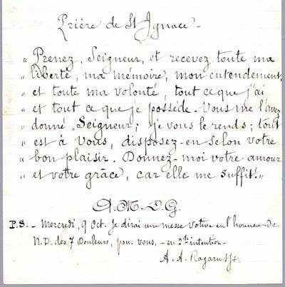 In September 1901, Mother Joseph wrote to the Reverend Aloysius Ragaru, SJ, at Gonzaga University, Spokane, who had directed her retreat earlier in the year. She asked him to send the Prayer of St. Ignatius, which he had mentioned to her: "Now I am incapable of doing anything, Reverend Father, except prepare myself for my approaching end.... If you have this prayer close at hand I would be happy to have a copy. What helped the saints to gain entrance into eternity may be a means for me also." Father Ragaru responded with this hand-written copy of the prayer.
