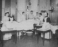 The nursing sisters regularly read medical books and attended lectures by Dr. Kinney to stay abreast of the latest developments in patient care. They also relied heavily on their own materia medica, The Little Medical Guide of the Sisters of Charity of Providence, first published by the Mother House in Montreal in 1869 and regularly updated. The women spared no expense when outfitting the hospital for the future. In 1879, for example, St. Vincent's installed telephones for $2.50 a month.(21) The sisters also were exceedingly thrifty, however, doing most of the cleaning, shopping, and cooking themselves and accepting donations of old towels and linen that could be boiled, cut, and torn for bandages.