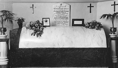 Mother Gamelin's original tomb, in the crypt below the chapel in the Sisters of Providence Mother House (Providence Asile), on Catherine Street, Montreal. The brick vault was later covered by plaster, with a marble overlay added in 1951, the centenary of her death.