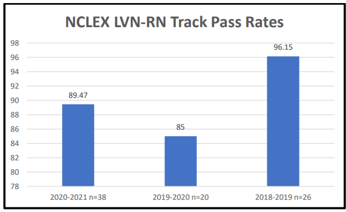 The traditional program length is 64-weeks.The LVN-RN track length is 27- weeks.