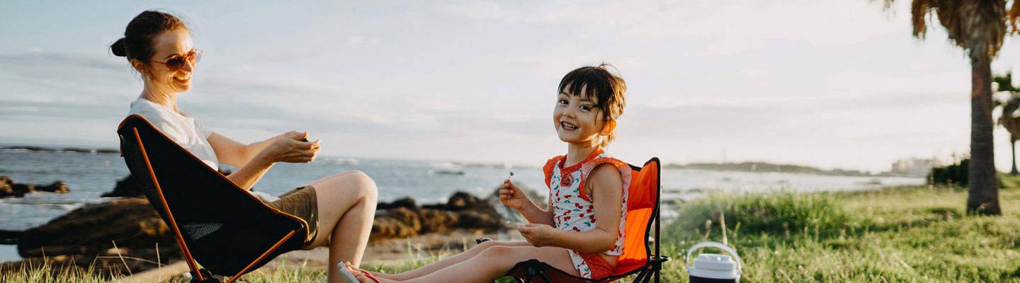 Young girl sitting on beach chair with mother by the beach