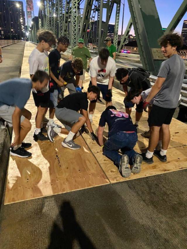 Members of the Cleveland High School football team continue a tradition of signing the last piece of plywood that they have installed on the Hawthorne Bridge. 530 sheets of plywood are needed to cover the one lane of the bridge used during Providence Bridge Pedal.