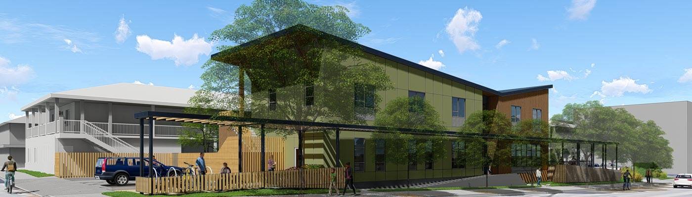 Residents and recuperative care participants have access to a community room and kitchen as well as outdoor gathering spaces. Everyone is encouraged to participate in on-site services and activities designed to develop community and mutual support.