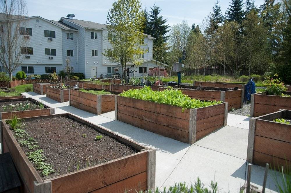 - Spaces for gathering and socializing with neighbors, including a community room, outdoor terrace and raised garden beds